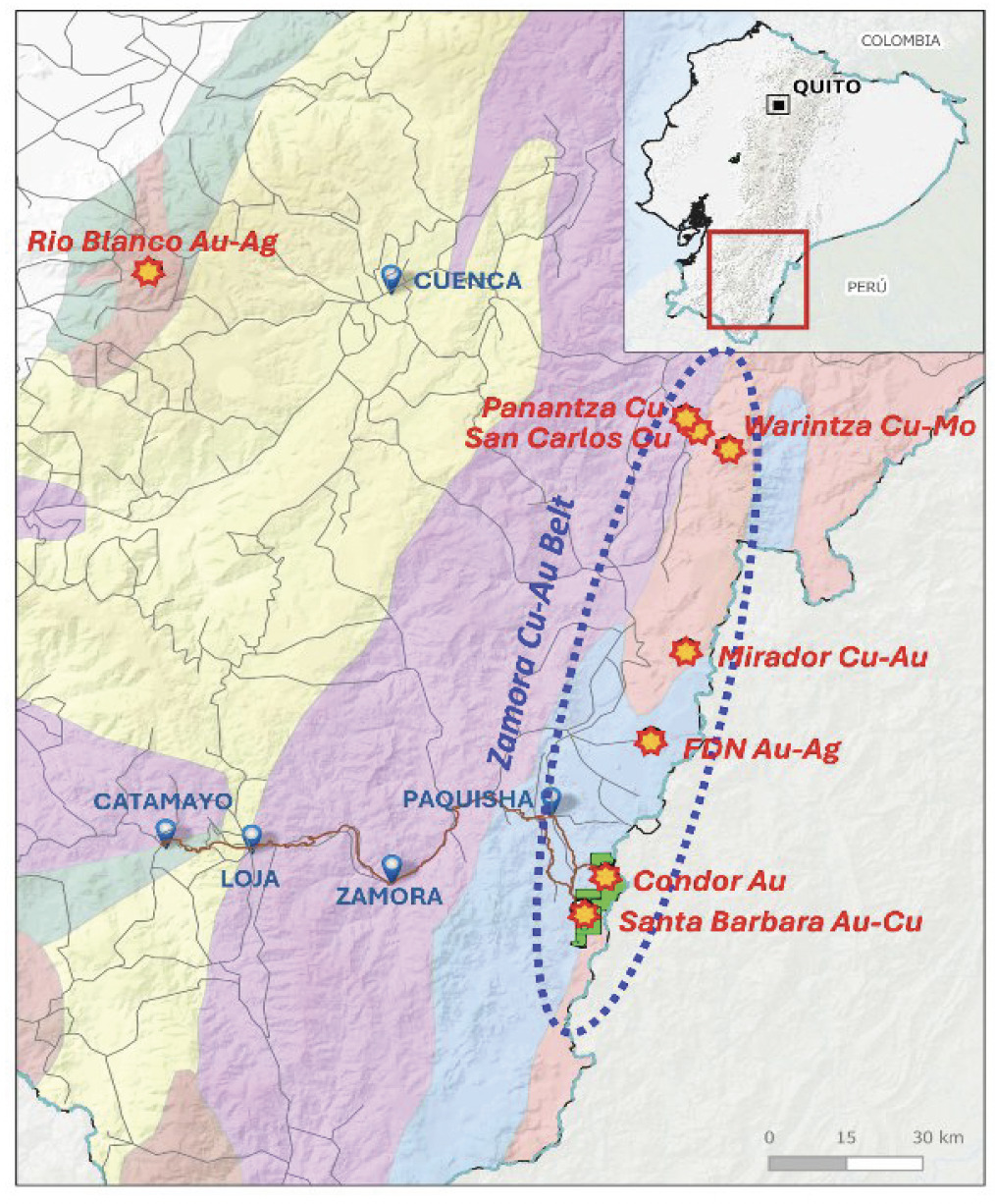The Project is located within the Zamora Copper-Gold Metallogeny Belt which hosts numerous significant deposits such as the Fruta del Norte epithermal gold deposit, the Mirador porphyry copper-gold deposit, the Warintza copper-moly deposit, and the Condor epithermal gold deposit. At Santa Barbara, gold and copper mineralization is hosted in alkalic basaltic andesite and porphyritic diorite dykes. The age of the basaltic andesite is unknown but likely belongs to the Piuntza Formation of Triassic-Lower Jurassic age, which also hosts epithermal gold mineralization at the Fruta del Norte Mine.