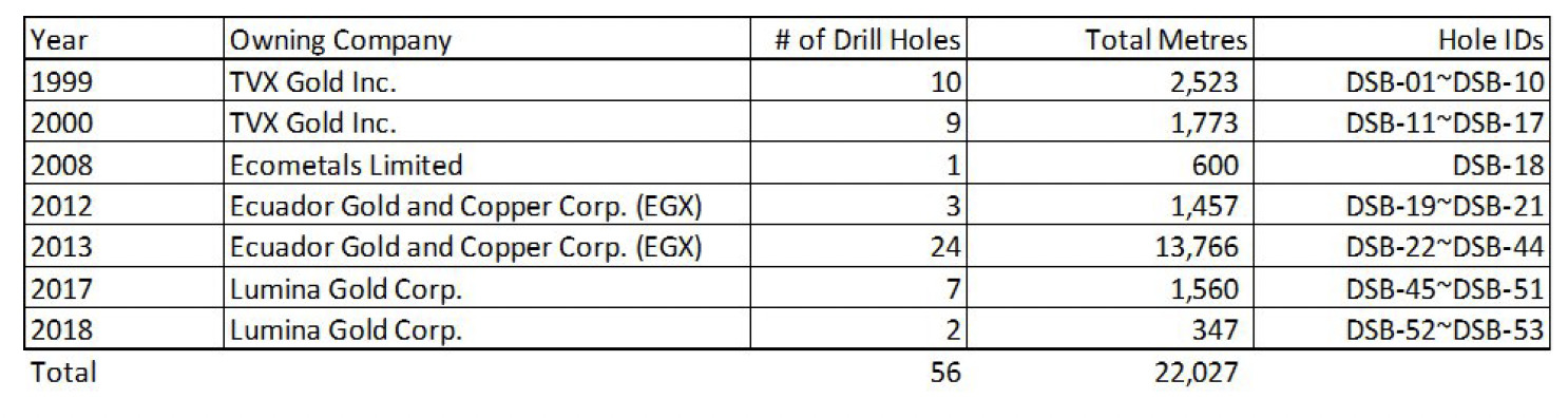 A total of 22,027 m of diamond drilling in 56 holes were completed by various owners from 1999 until 2018. The table below provides a summary of all drilling completed at the Project to date.