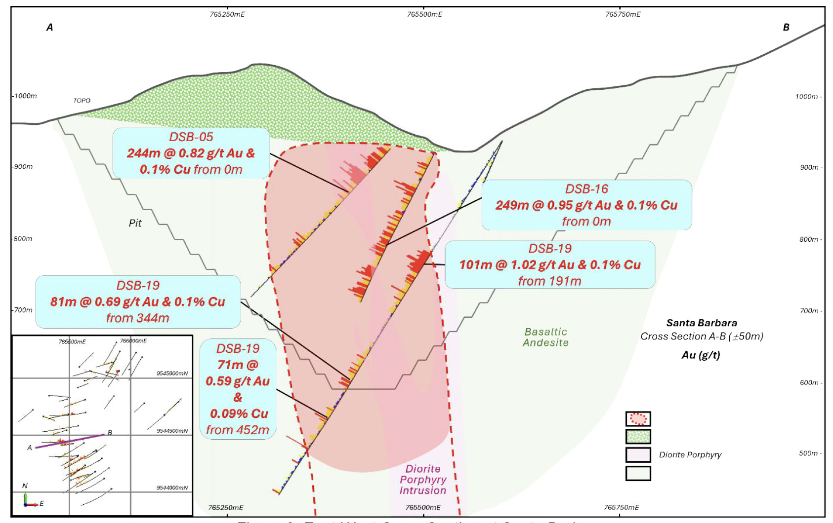 The mineralized zone defined to date has dimensions of 1.2 km north-south, 500 m east-west, and extends to a depth of more than 500 m. The Project remains open in all directions and at depth. Figure 2 shows a plan view of Santa Barbara highlighting the local geology and gold intercepts from past drilling. Figure 3 shows an east-west oriented vertical cross-section looking towards the north.